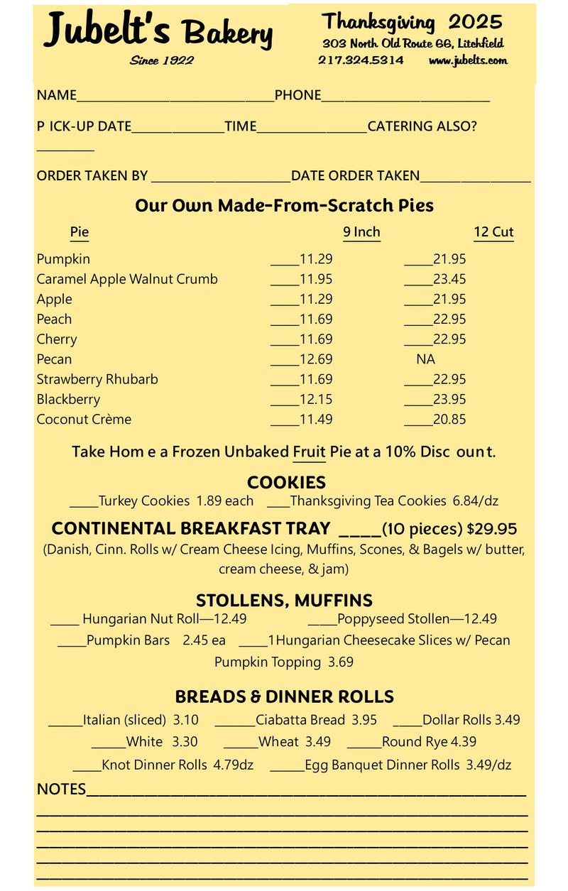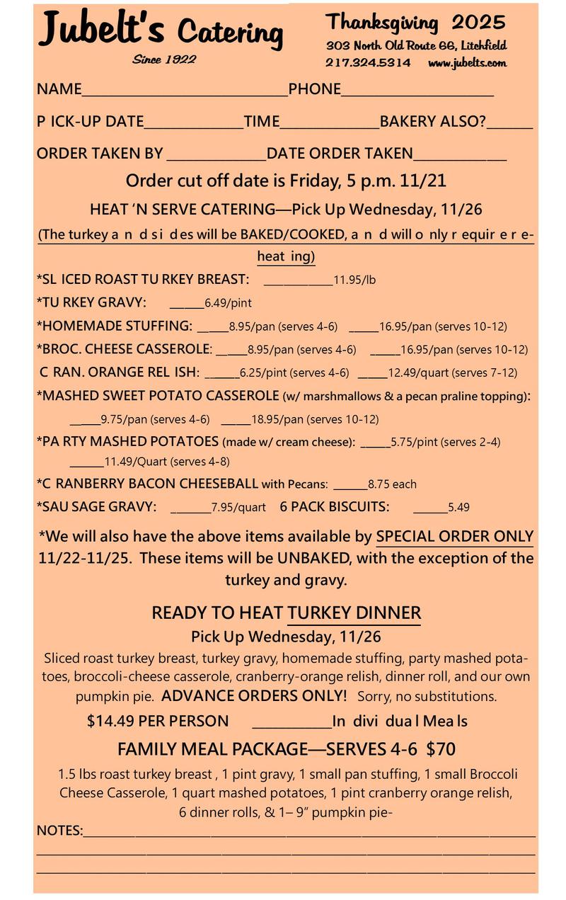 Cut off for Thanksgiving Dinners and Catering is Friday, 11/21. 12 Cut pie orders must also be in on that date. Thank you.